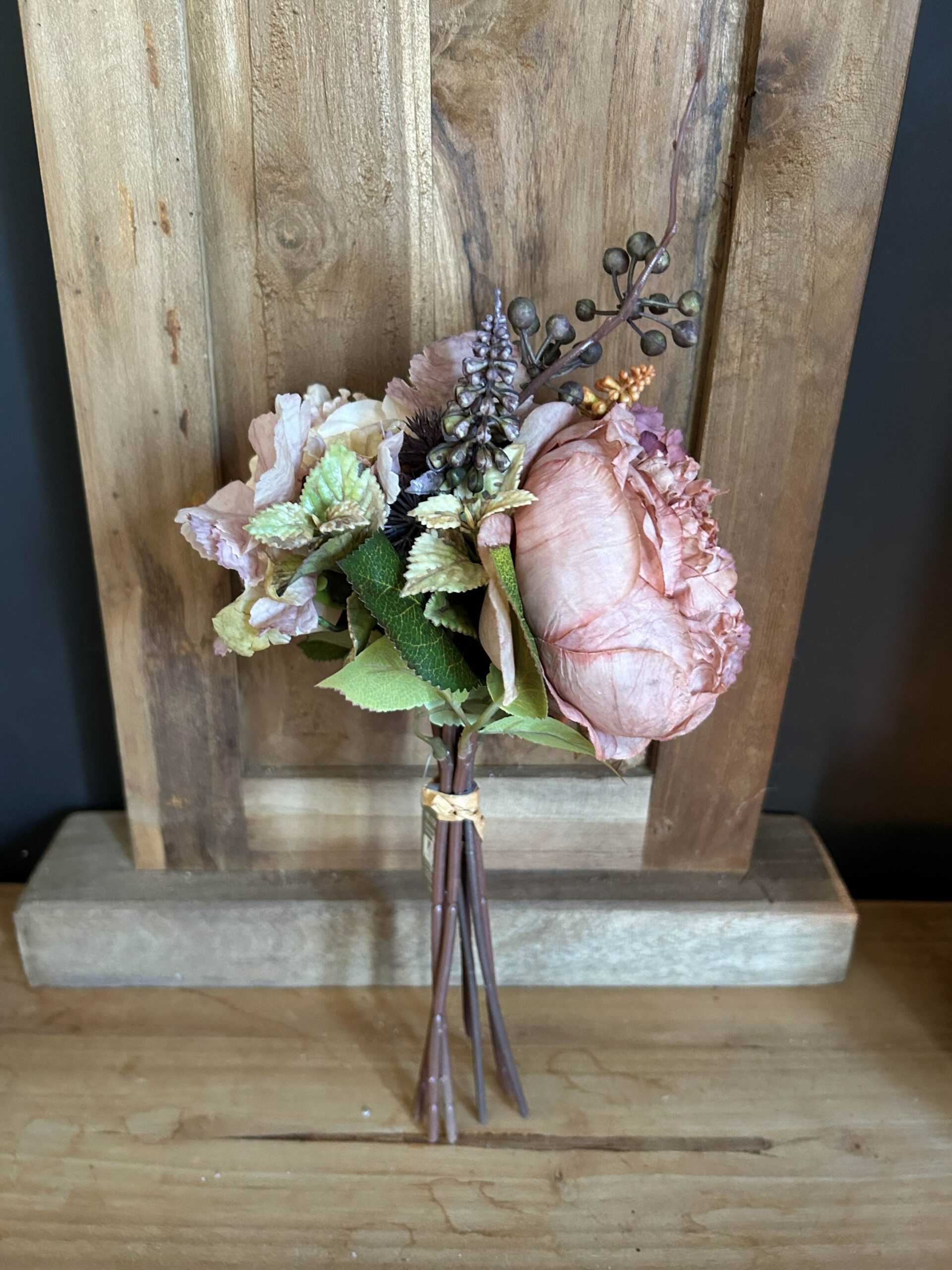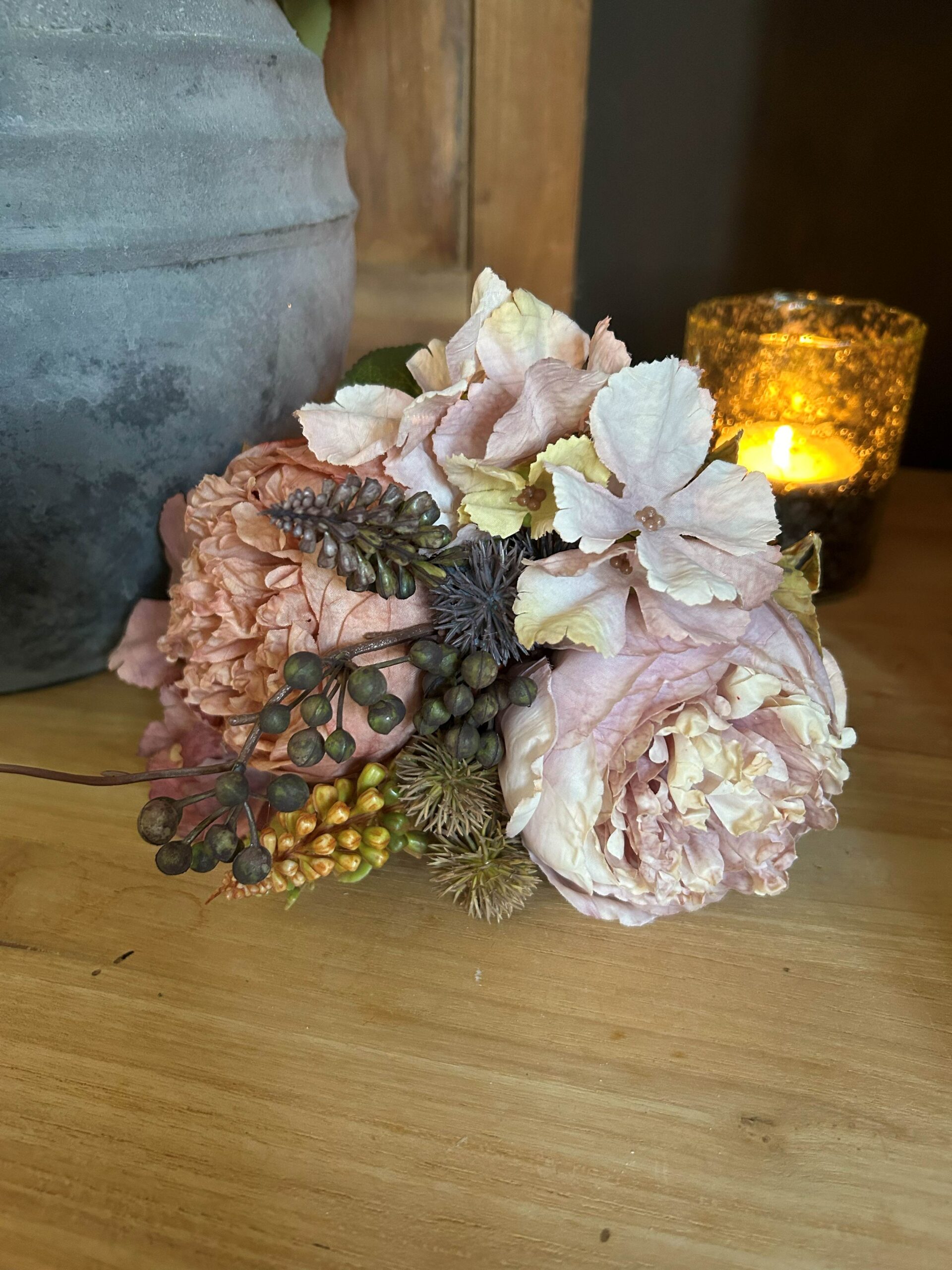 Dit stijlvolle boeket combineert zachte pastelkleuren met natuurlijke, warme tinten voor een tijdloze en rustgevende uitstraling. De zorgvuldig samengestelde mix van kunst bloemen en takjes zorgt voor een luxe en realistisch effect — nauwelijks van echt te onderscheiden. Heel leuk om meerdere boeketjes te decoreren op een grote vaas of pot. In de vaas op de foto zijn 6 boeketjes gebruikt. Maar natuurlijk ook perfect als klein boeketje op een vaasje.