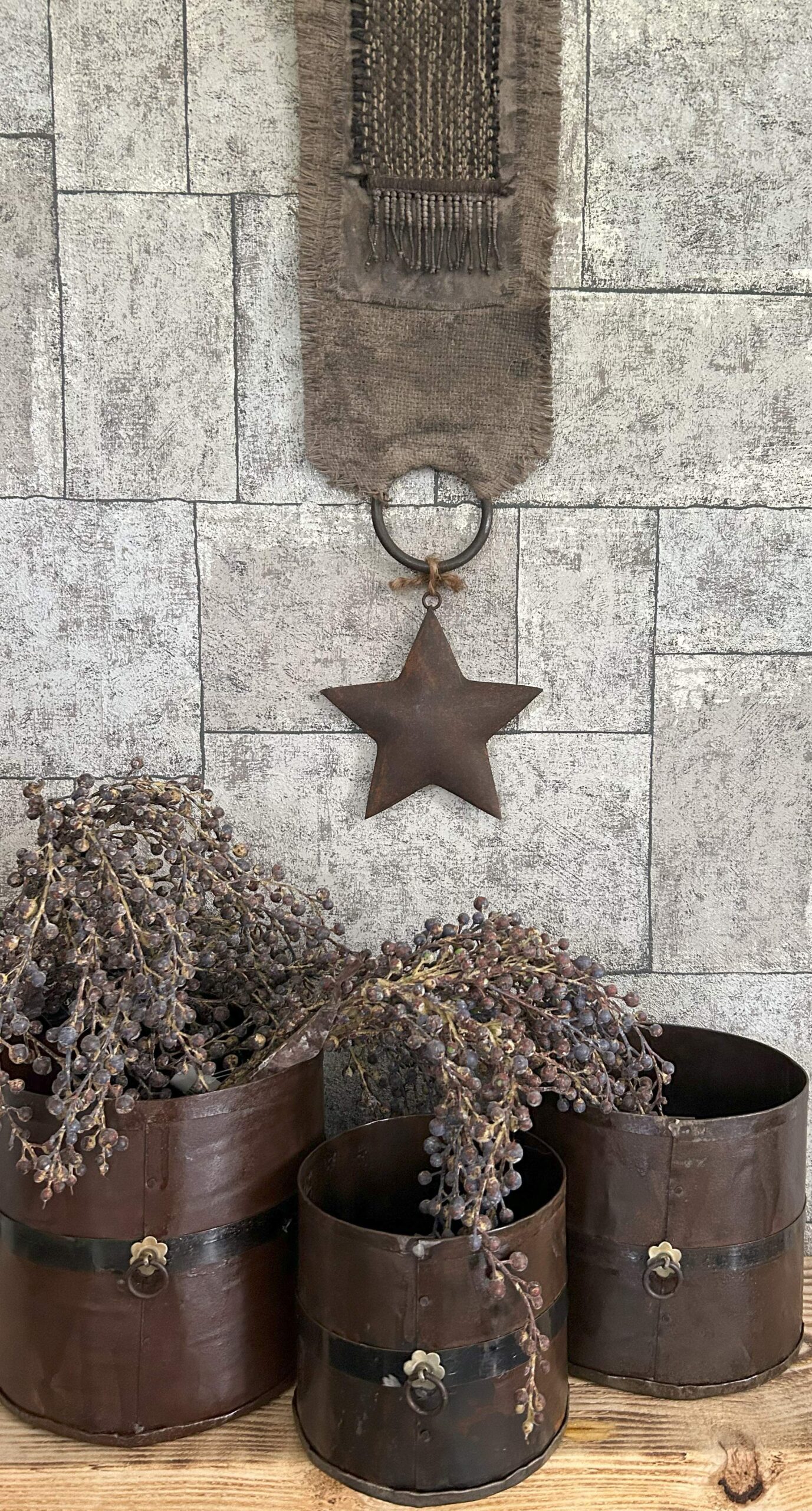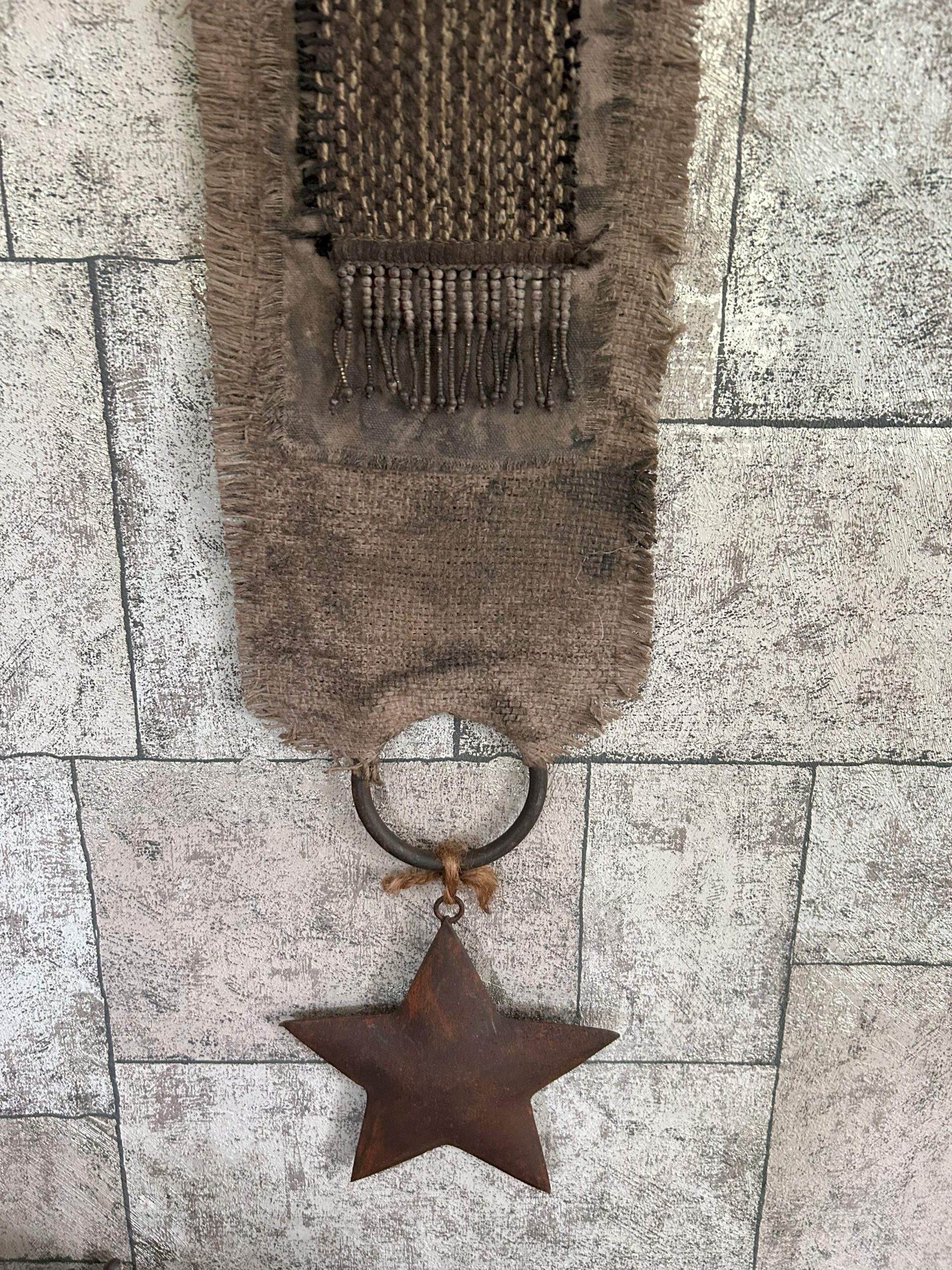 Deze prachtige deur/wand hanger heeft een stoere en sobere uitsraling. De hanger is gemaakt van jute en versierd met kraaltjes, onderaan hangt een een ijzeren ster. De natruurlijke kleuren en robuuste materialen zorgen voor een landelijke en authentieke sfeer in huis. Hang hem bijvoorbeeld aan een muur, wand of deur voor een stoere toevoeging aan je interieur.