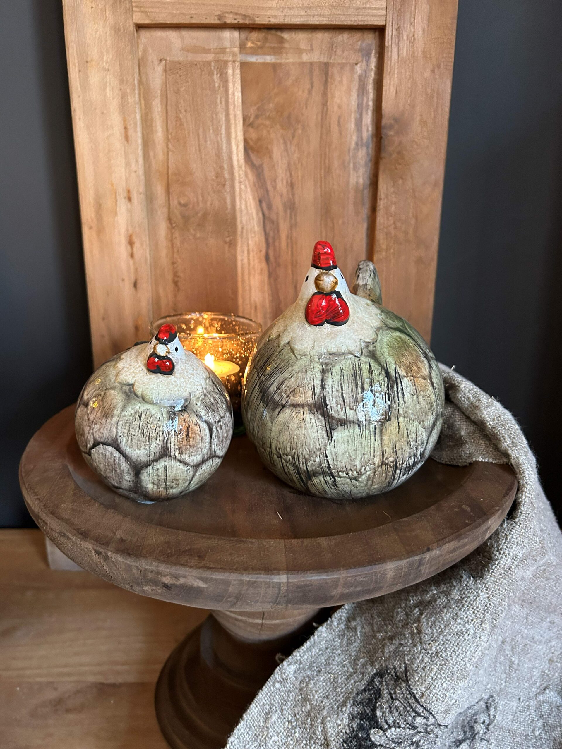Deze kippen zijn perfect als blikvanger op een dressoir, bijzettafel of in een landelijke keuken. Combineer ze met kaarslicht, hout en natuurlijke decoratie voor een sfeervol geheel dat direct een huiselijk gevoel geeft.