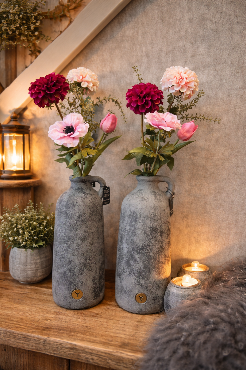 Creëer een warme, uitnodigende sfeer in huis met deze prachtige combinatie van kruik en boeket. Een echte blikvanger die elk seizoen tot zijn recht komt.