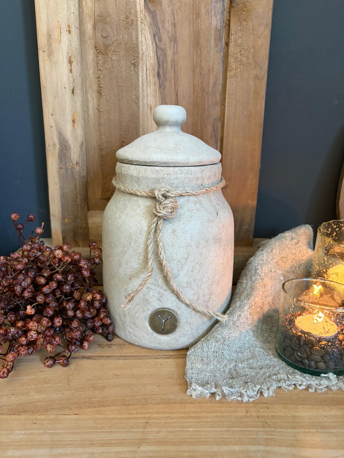 Deze stijlvolle pot met deksel uit de Majestic Taupe collectie van Brynxz straalt rust en eenvoud uit. De zachte taupe kleur, robuuste afwerking en het subtiele touwdetail geven de pot een warme, landelijke uitstraling. Perfect als decoratief item in keuken, woonkamer of hal, zowel solo als in combinatie met andere Brynxz items. Tijdloos, sober en vol karakter.