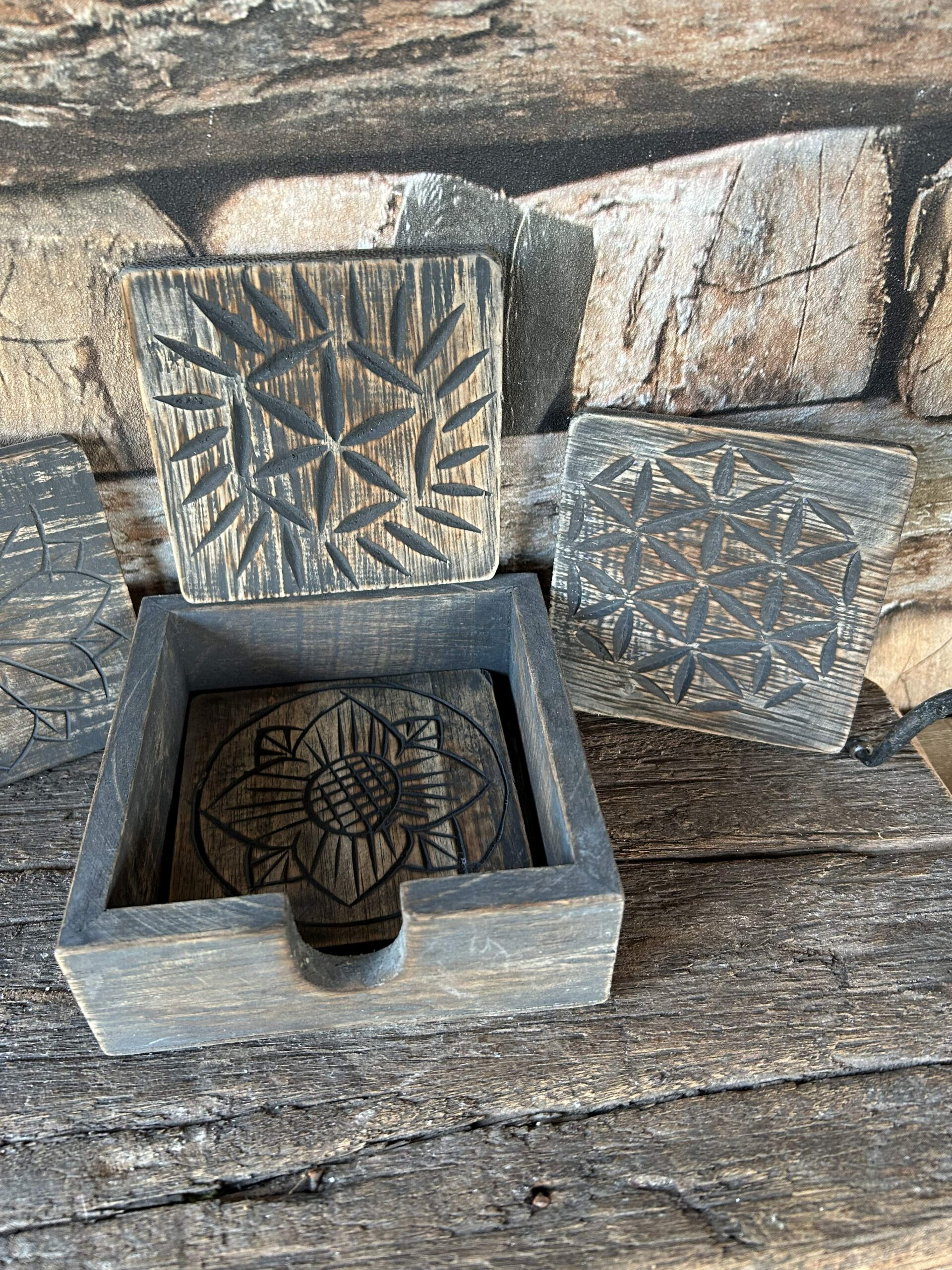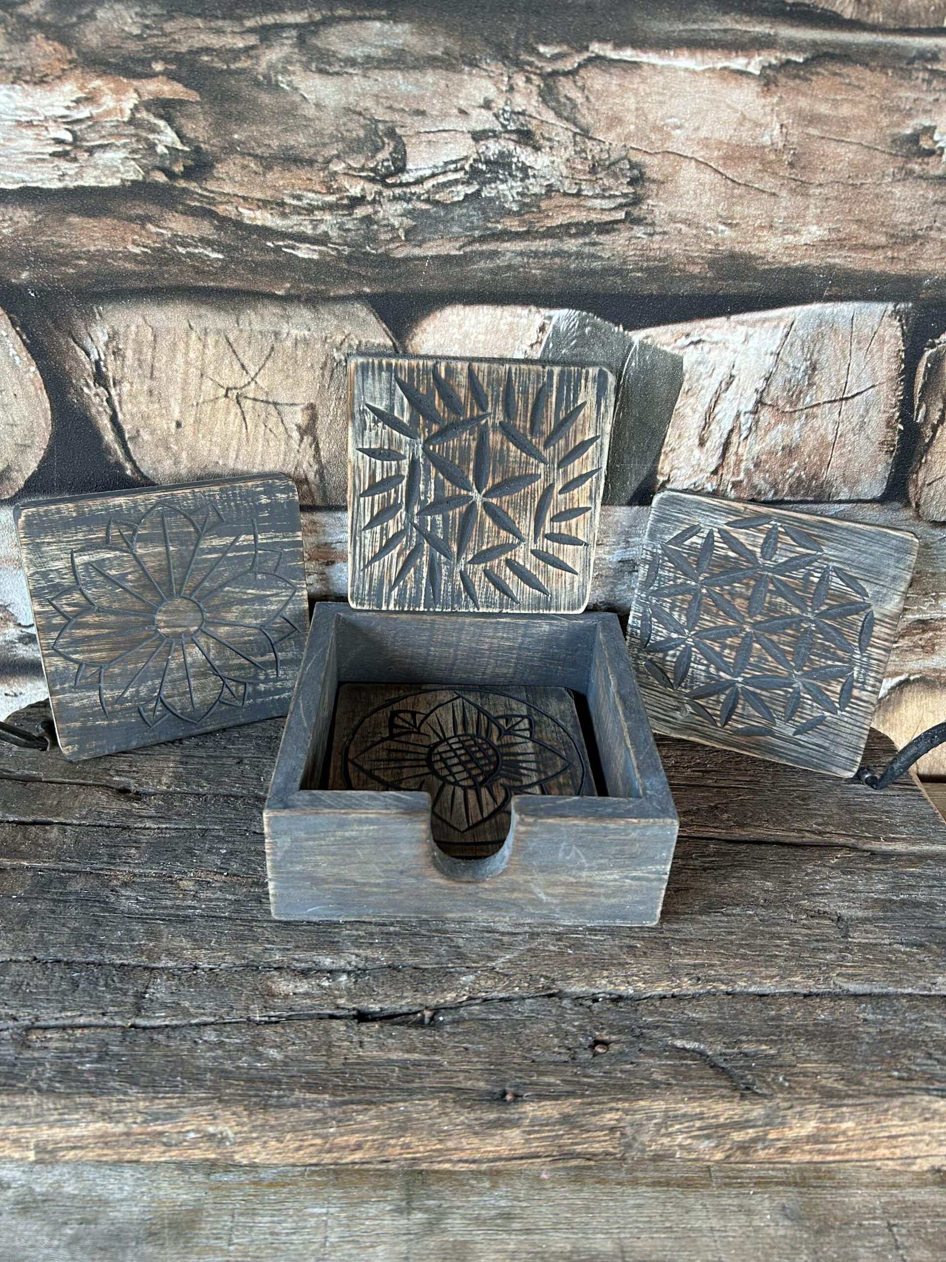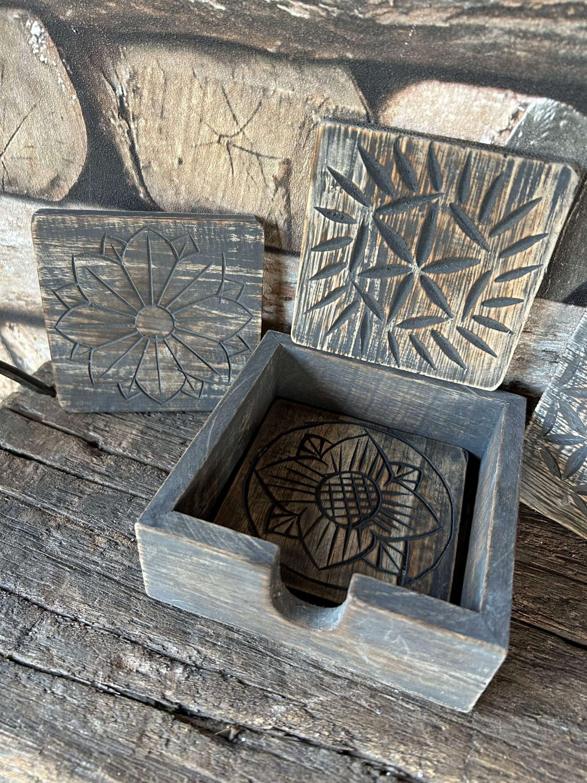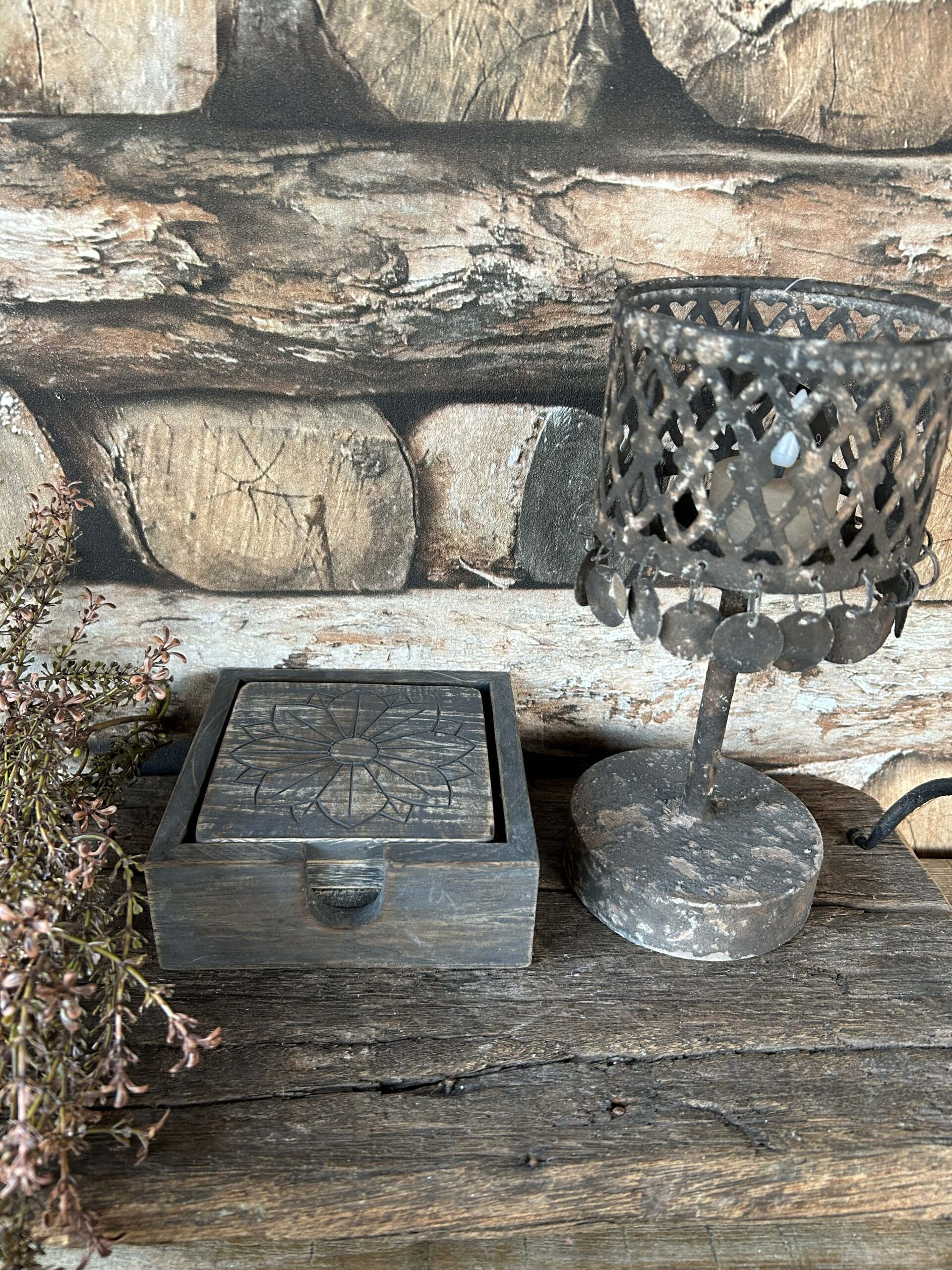 Set van 4 houten onderzetters. Stoer, sfeervol en praktisch. Geef je tafel een warme en karaktervolle uitstraling met deze prachtige set van 4 houten onderzetters. Elke onderzetter is voorzien van een uniek, fraai gegraveerd patroon, wat zorgt voor een ambachtelijke en stijlvolle look. De doorleefde houtkleur en het robuuste design maken deze set perfect voor een landelijk, sober of industrieel interieur.