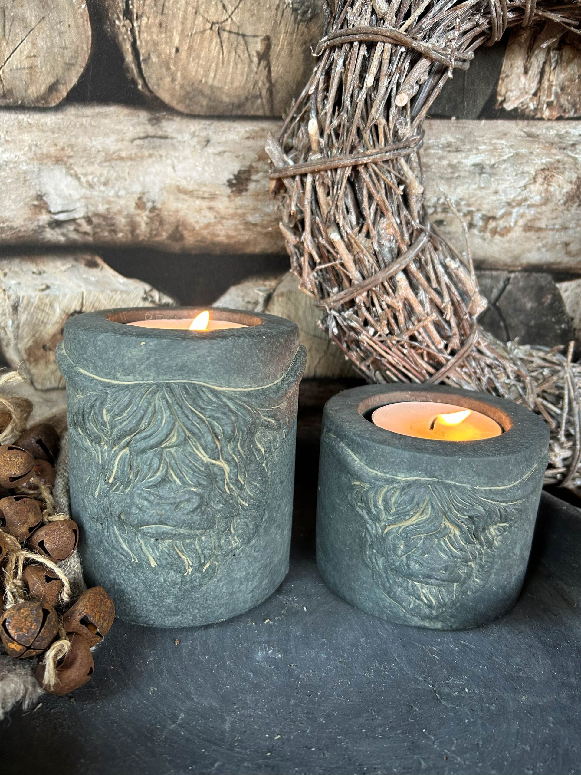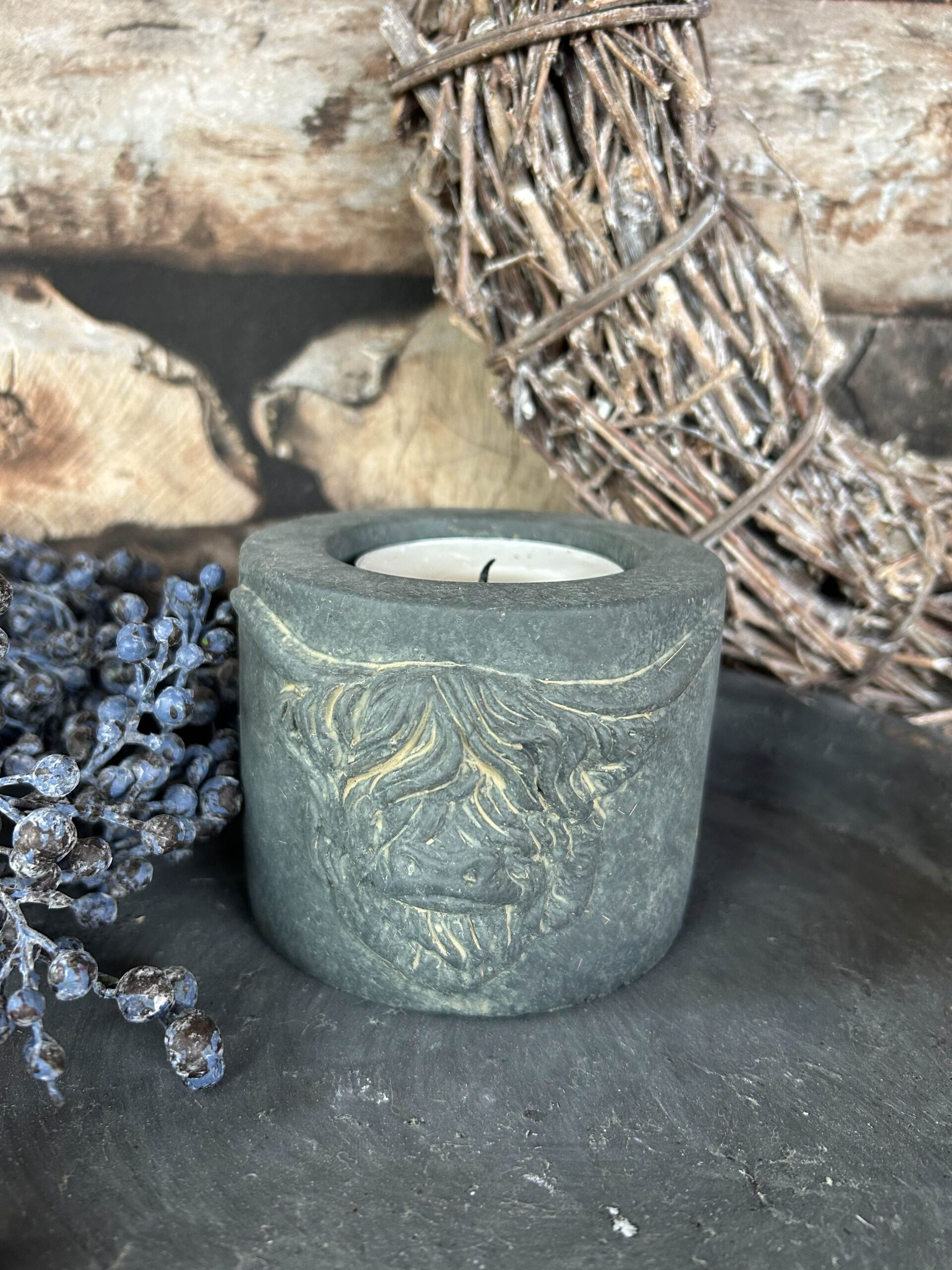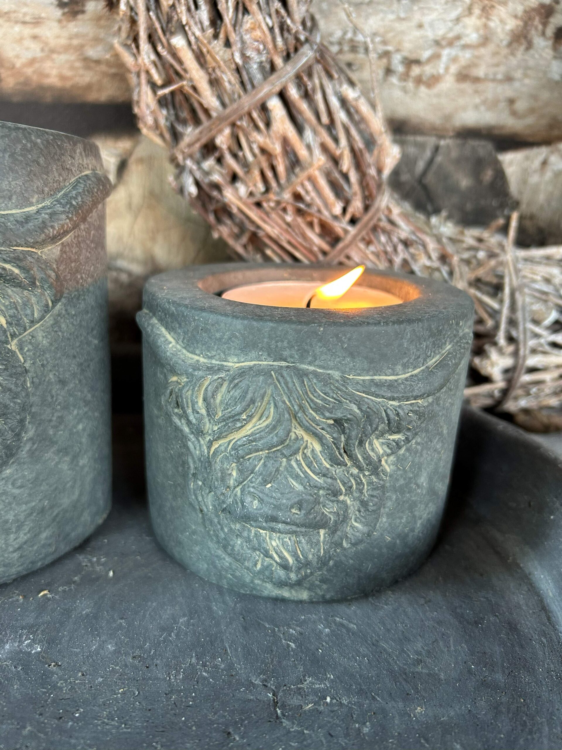Deze Schotse Hooglander waxinelichthouder komt uit de Majestic Vintage collectie van Brynxz. Met de stoere buitenzijde en de warme verweerde grijs tinten brengt het sfeer in je interieur, wat perfect past bij een landelijke en sobere inrichting.