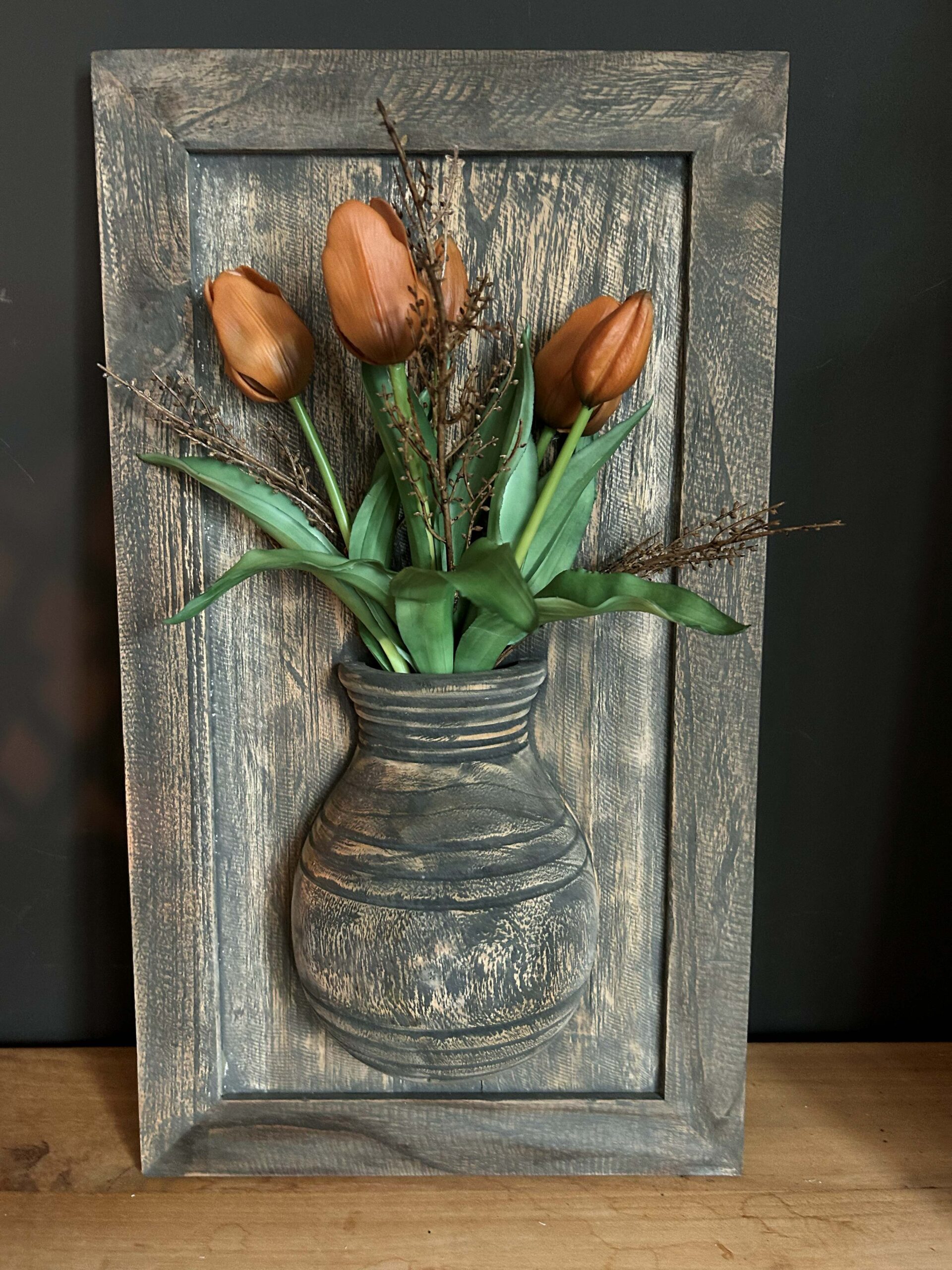 Dit leuke oranje kunst tulpen boeketje past perfect in het houten wandpaneel met halve pot.