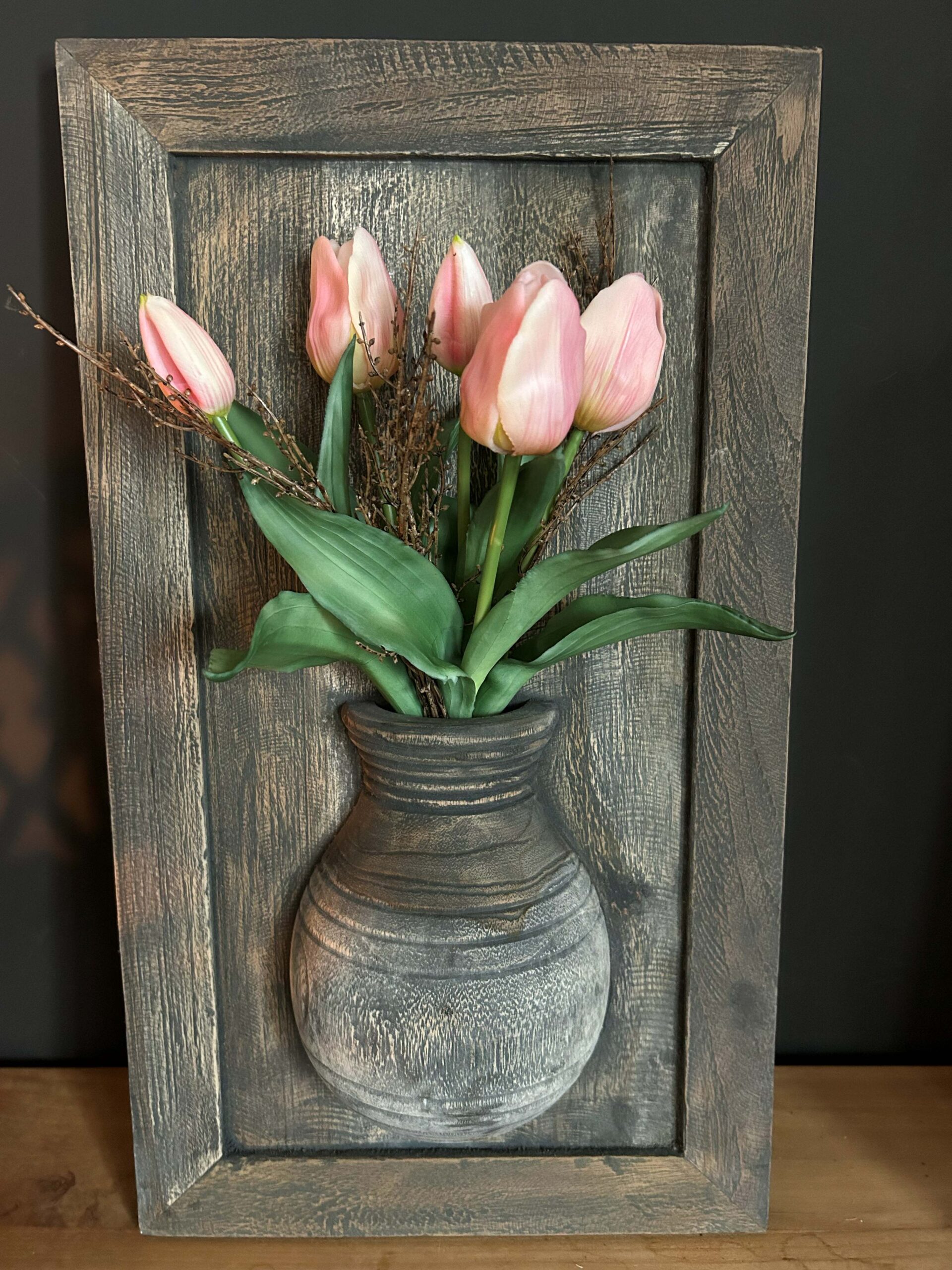 Dit leuke roze kunst tulpen boeketje past perfect in het houten wandpaneel met halve pot.