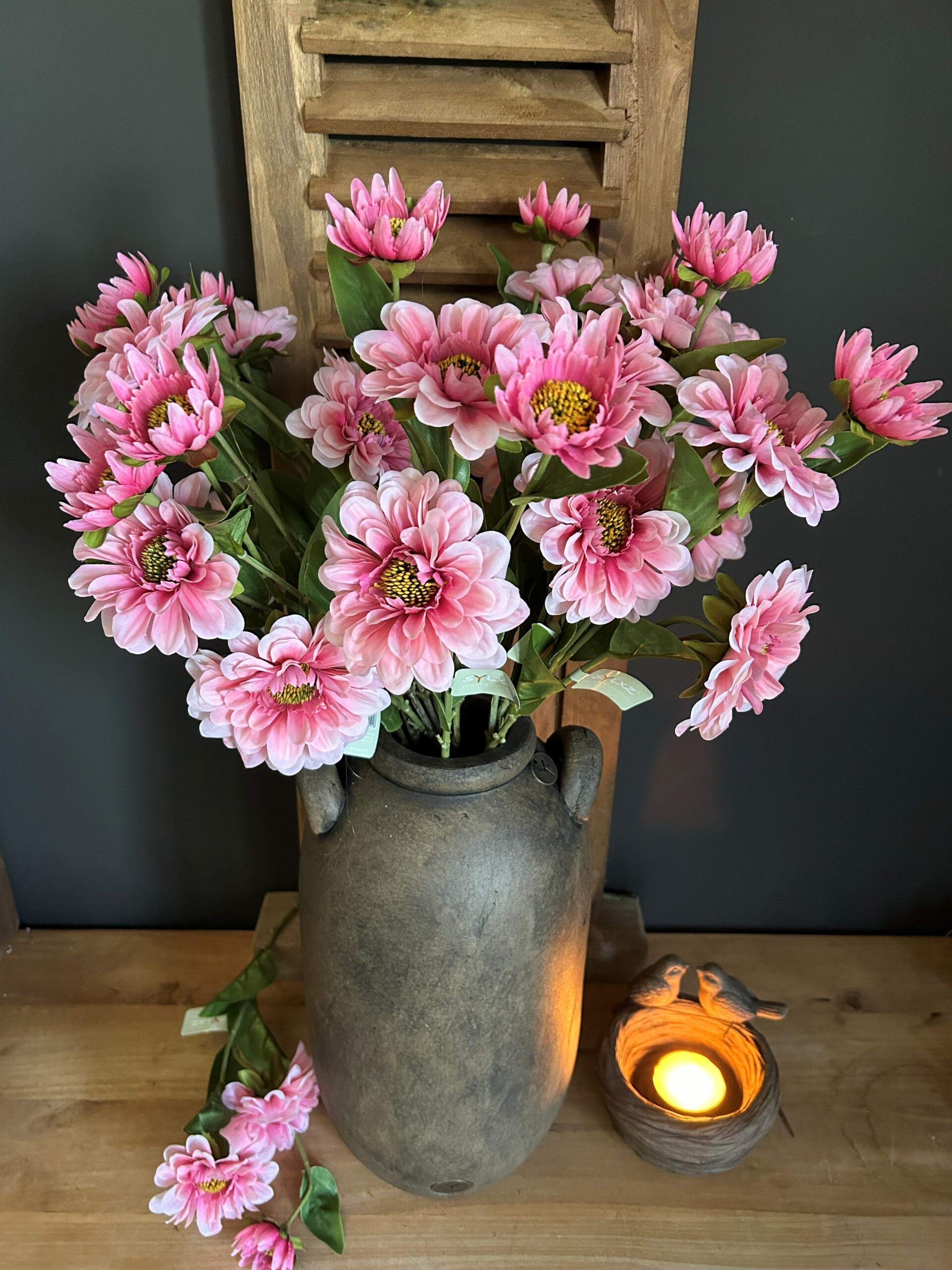 Breng kleur en karakter in huis met deze prachtige Zinia . Deze stijlvolle kunstzinia in een zacht roze kleur heeft een lengte van 72 cm. Daardoor zijn ze perfect voor hoge vazen of als opvallend element in een boeket. De verfijnde bloemkoppen en natuurlijke bladstructuur zorgen voor een realistische uitstraling die nauwelijks van echt te onderscheiden is.